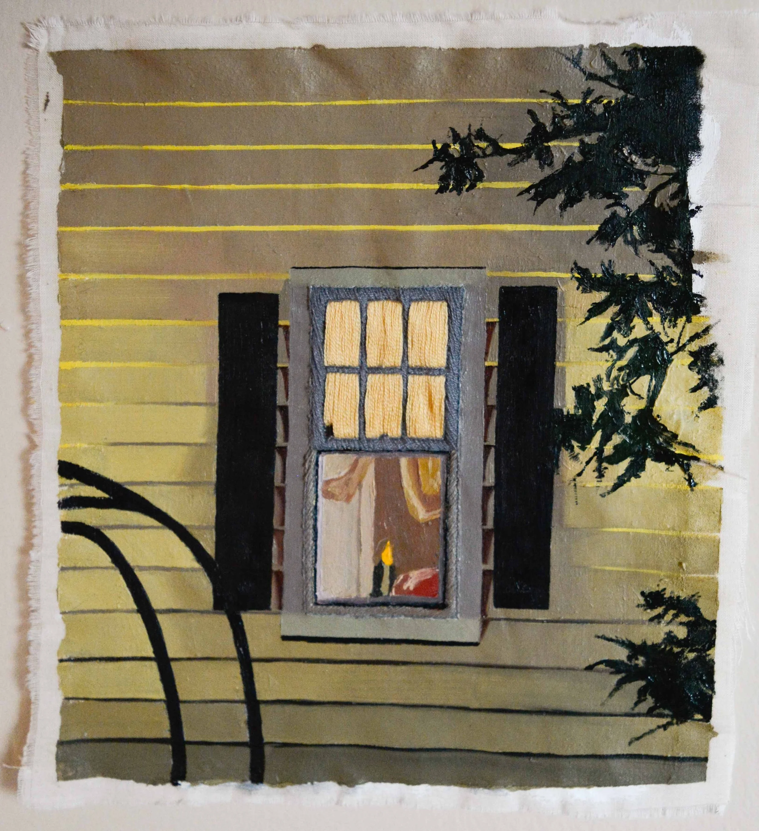 “Night Lit” oil and embroidery on canvas, 9.5 x 9”, 2025, $175
