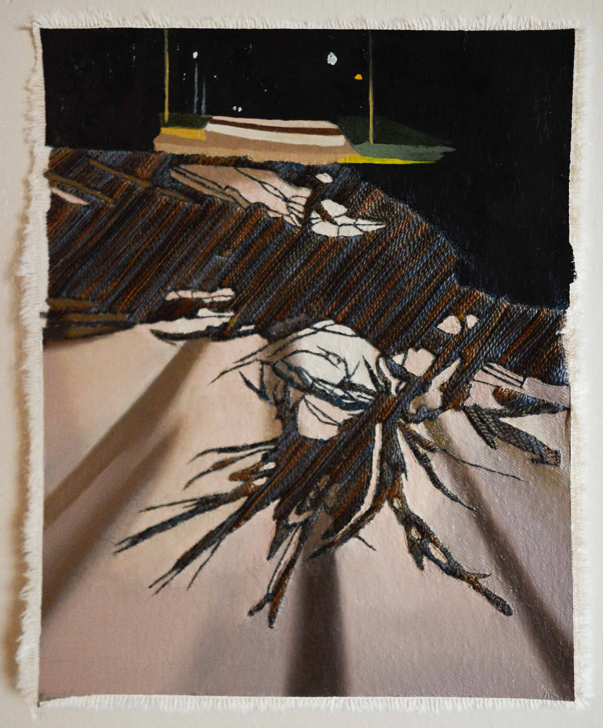 “Descent” oil and embroidery on unstretched canvas, 10x8”, 2022, NFS